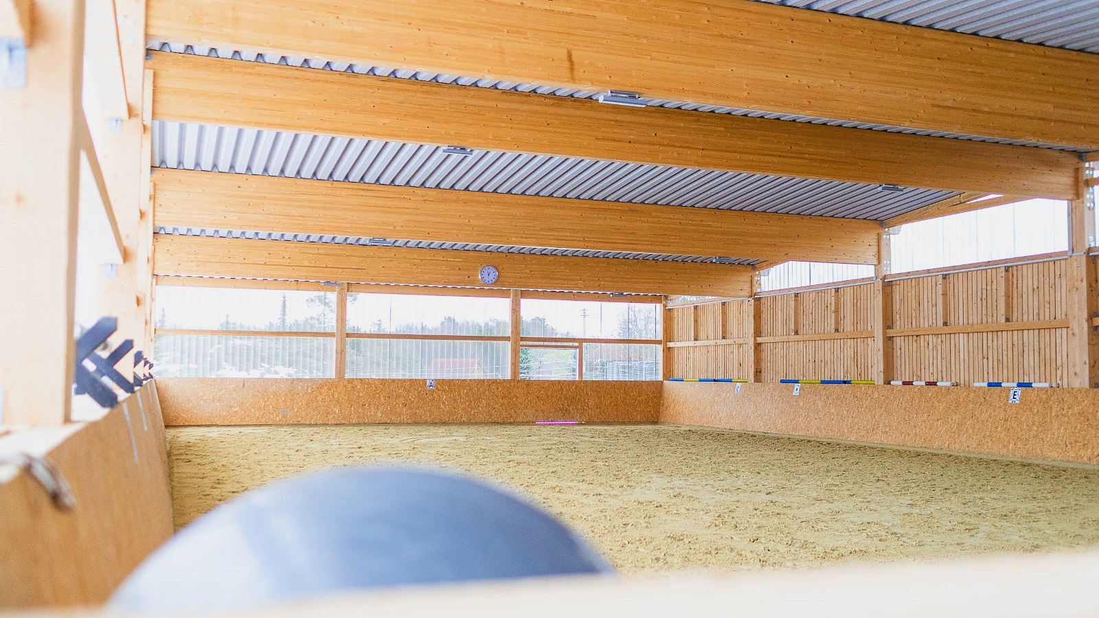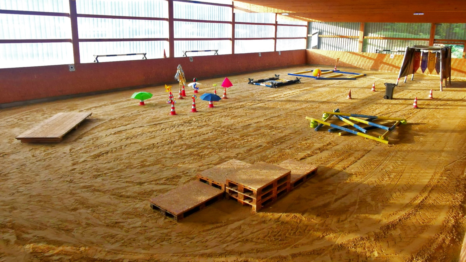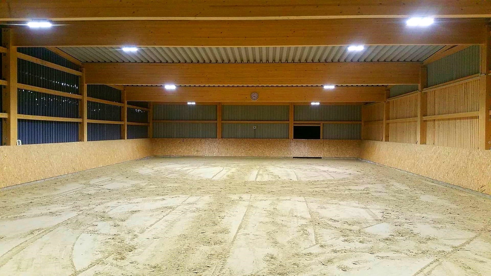Eine helle und freundliche Reithalle mit einem Hufschlag von 15,5 x 30,5 Metern mit hervorragendem Sandboden so wie
