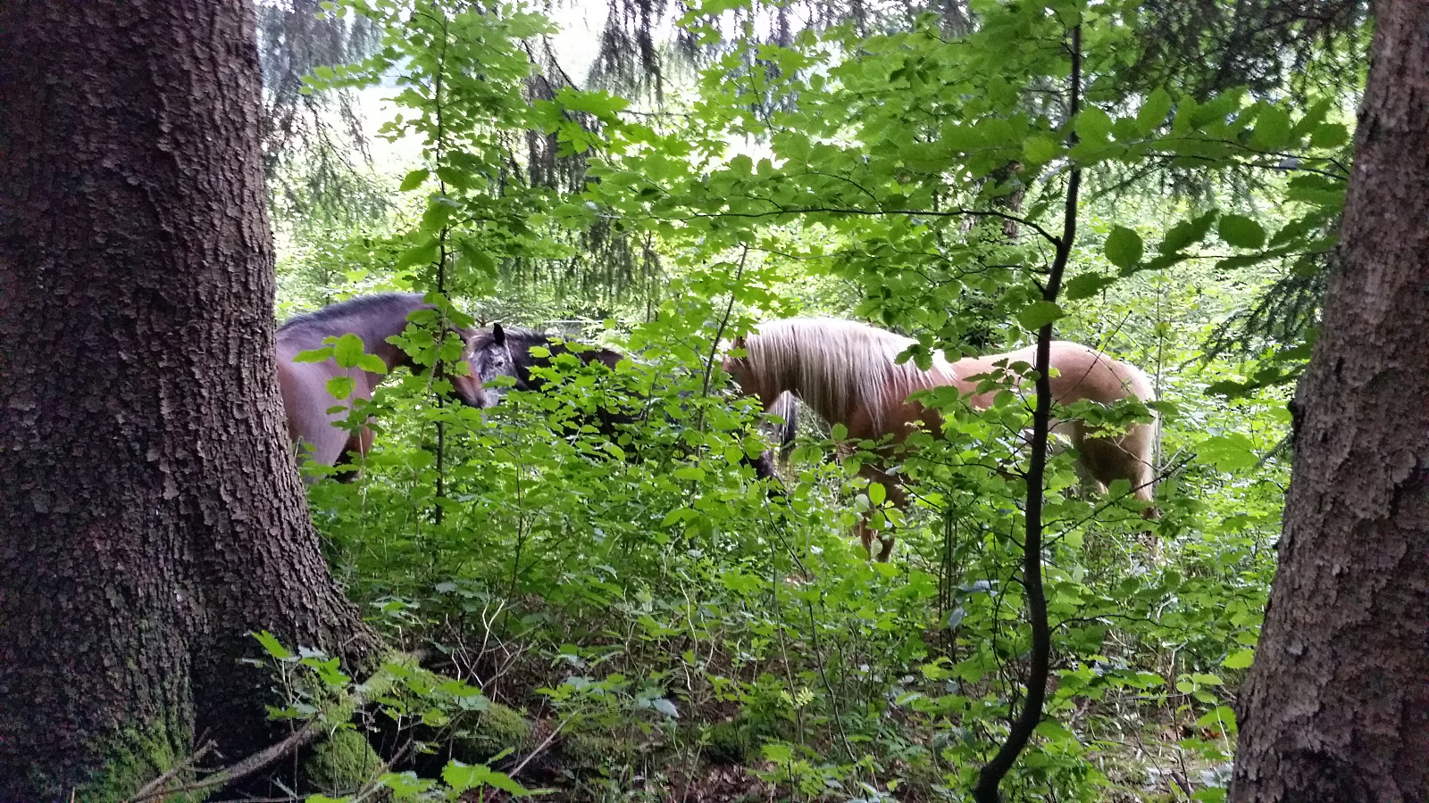 auf der großen Sommerkoppel stehen, haben sie ausreichend Schutz im knapp 3000 m² eingezäunten Wald mit einer ca. 30 Jahre alten Schonung.