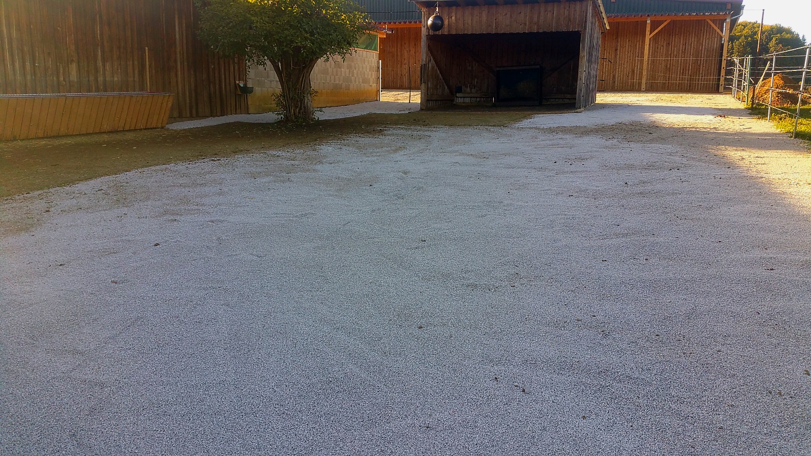 Ein knapp 1000 m² großer und komplett mit Bodengittern ausgelegter Paddock um den Pferden einen trockenen und