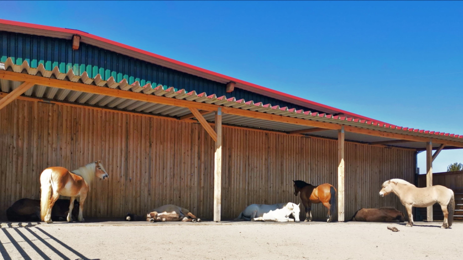 Am Hof können die Pferde jederzeit auf den Paddock zurück kehren wo sie alle Annehmlichkeiten ihres Stalles finden. Wenn sie