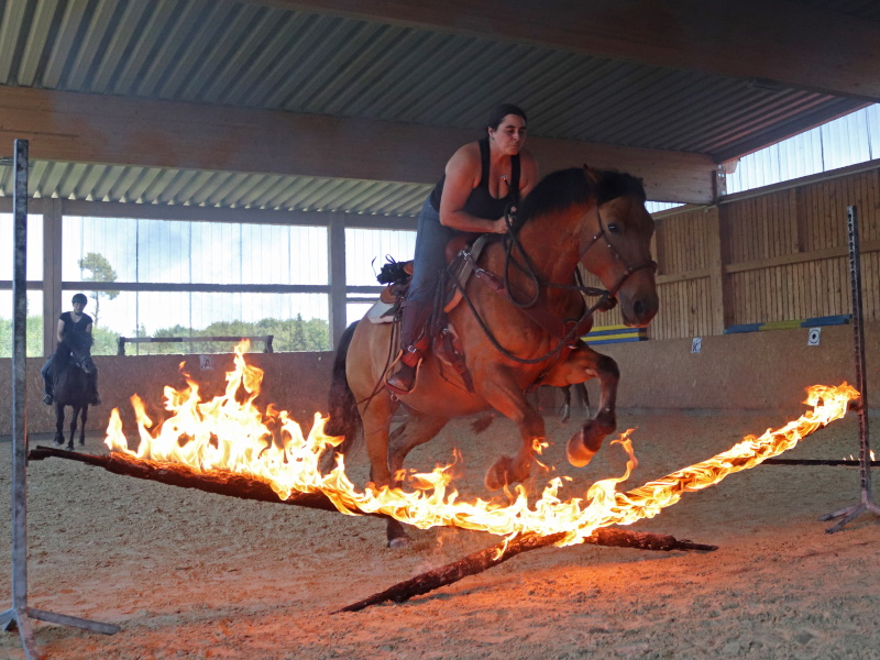 Hierbei wird die Verbindung zwischen Pferd und Mensch extrem gestärkt weil das Pferd den Menschen vertrauen muss um anschließend für ihn durchs Feuer zu gehen.