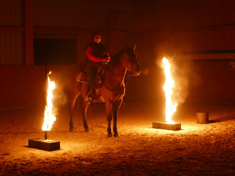 Bei gelassenen Pferd/Reiter Kombinationen besteht die Möglichkeit auch mit speziellen Feuerfakeln zu reiten. Zuerst werden die Aufgaben geführt vom Boden erarbeitet