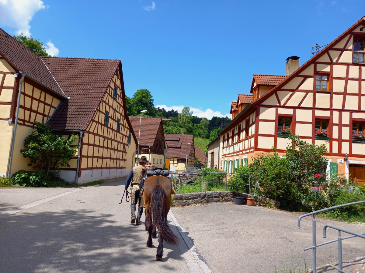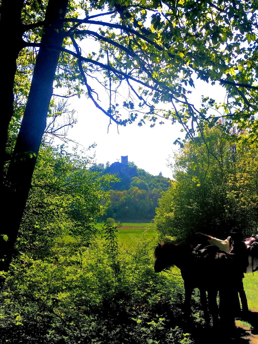 um sie zu erkunden. Wir folgen dem Höhenweg einige Kilometer weiter. Wir müssen nun das Trubachtal durchqueren. Unsere Pferde