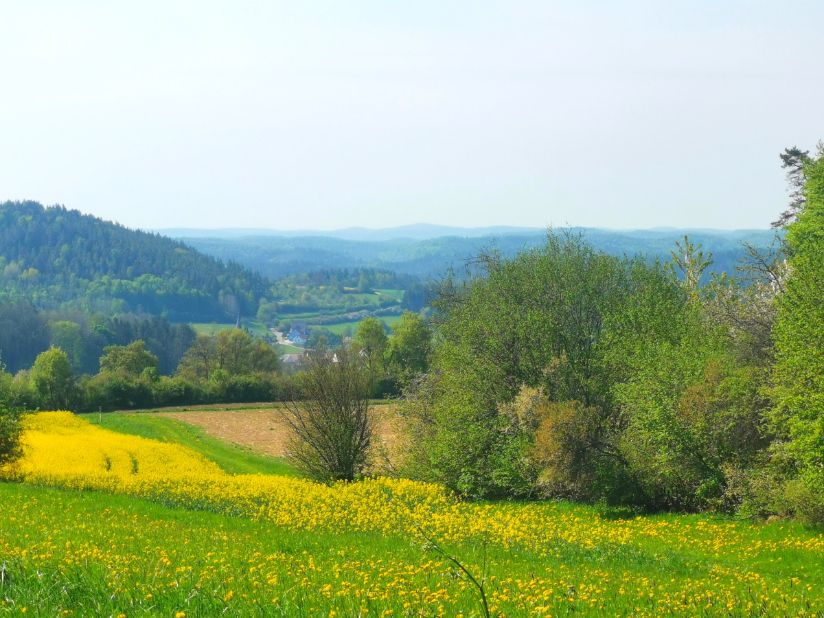 Wir erlangen den einen oder anderen schönen Fernblick mit der örtlichen Burg im Vordergund. Verschlungene Wiesenwege laden