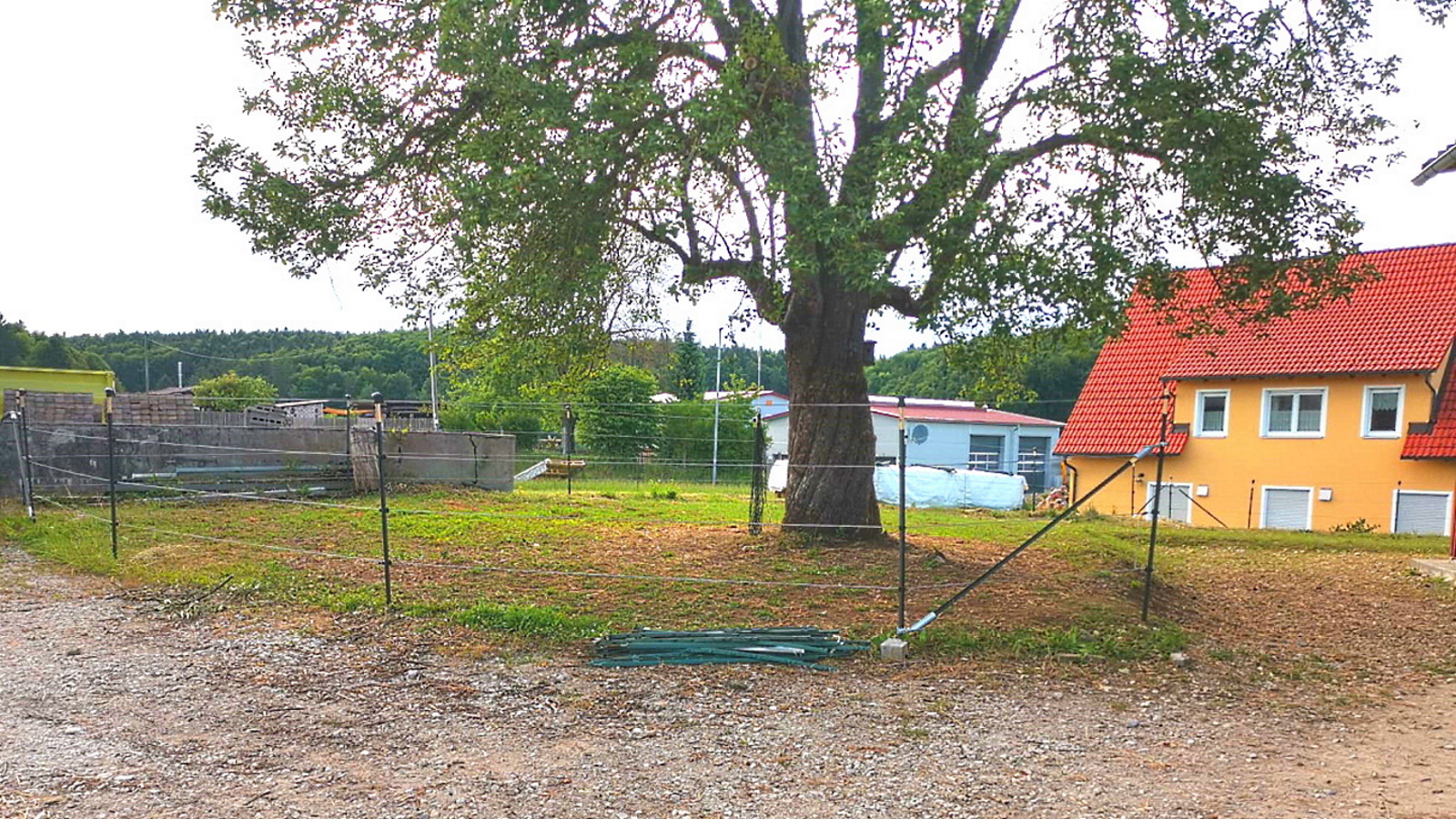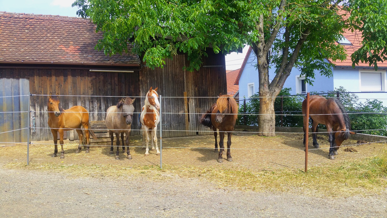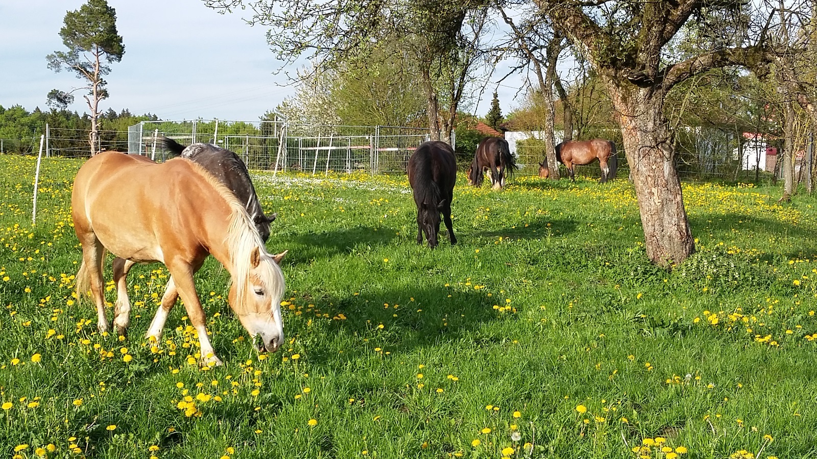 Wir haben eine kleine Koppel mit großem Baum als Wetterschutz zur Verfügung. Auf dieser Koppel